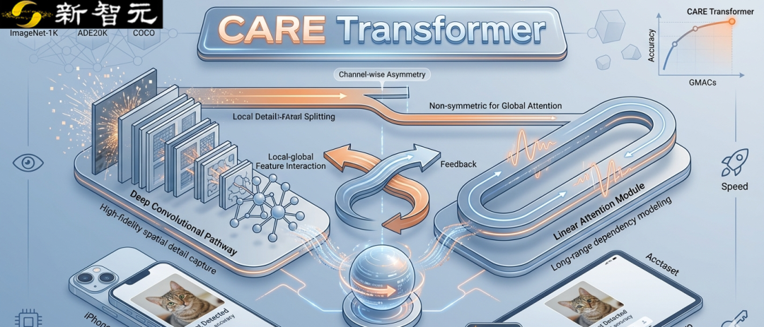 【新智元导读】南洋理工、北航与合工大联合提出CARE Transformer,以非对称解耦方式并行建模局部细节与全局依赖,通过通道拆分与双交互机制,显著降低线性注意力计算开销,同时提升特征表达能力。实验证明,该模型在iPhone与iPad上实现超低延迟下的高精度,成功打破移动端视觉Transformer“效率与精度不可兼得”的困局,为端侧AI落地提供全新范式。