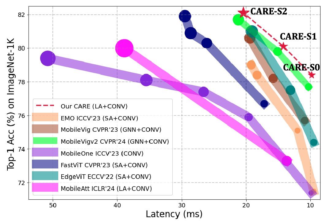 图2. CARE Transformer 与近期典型的移动端友好型模型在精度、延迟和 GMACs 平衡关系上的可视化比较。图中,标记越大,表示模型消耗的 GMACs 越多。「SA」、「LA」 和 「GNN」 分别表示这些方法分别基于自注意力、线性注意力和图神经网络。