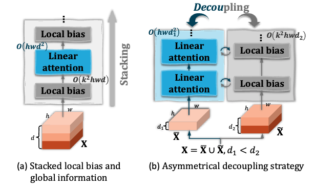 图1. (a) 堆叠式串型方案 (b) 和提出的非对称解耦式方法()。后者将局部归纳偏置与长程依赖分别进行建模,并进一步将线性注意力在通道维度上的二次计算开销缓解为 。其中,局部归纳偏置通过深度卷积来学习,而长程依赖则通过线性注意力来建模。