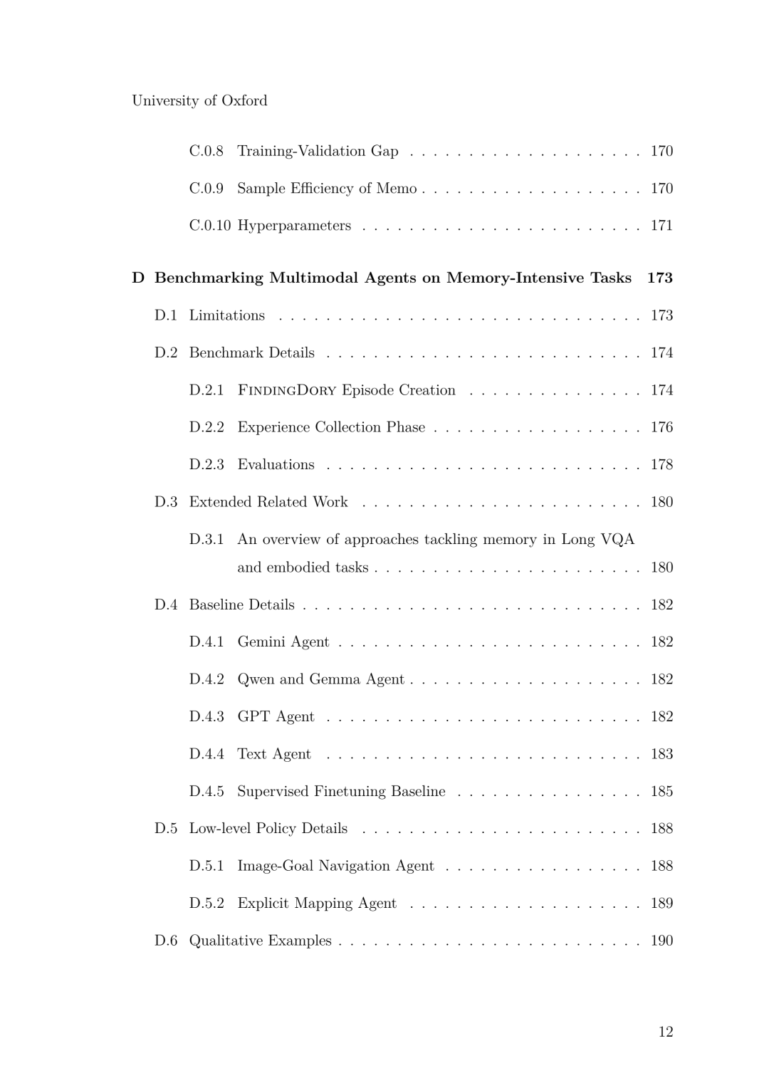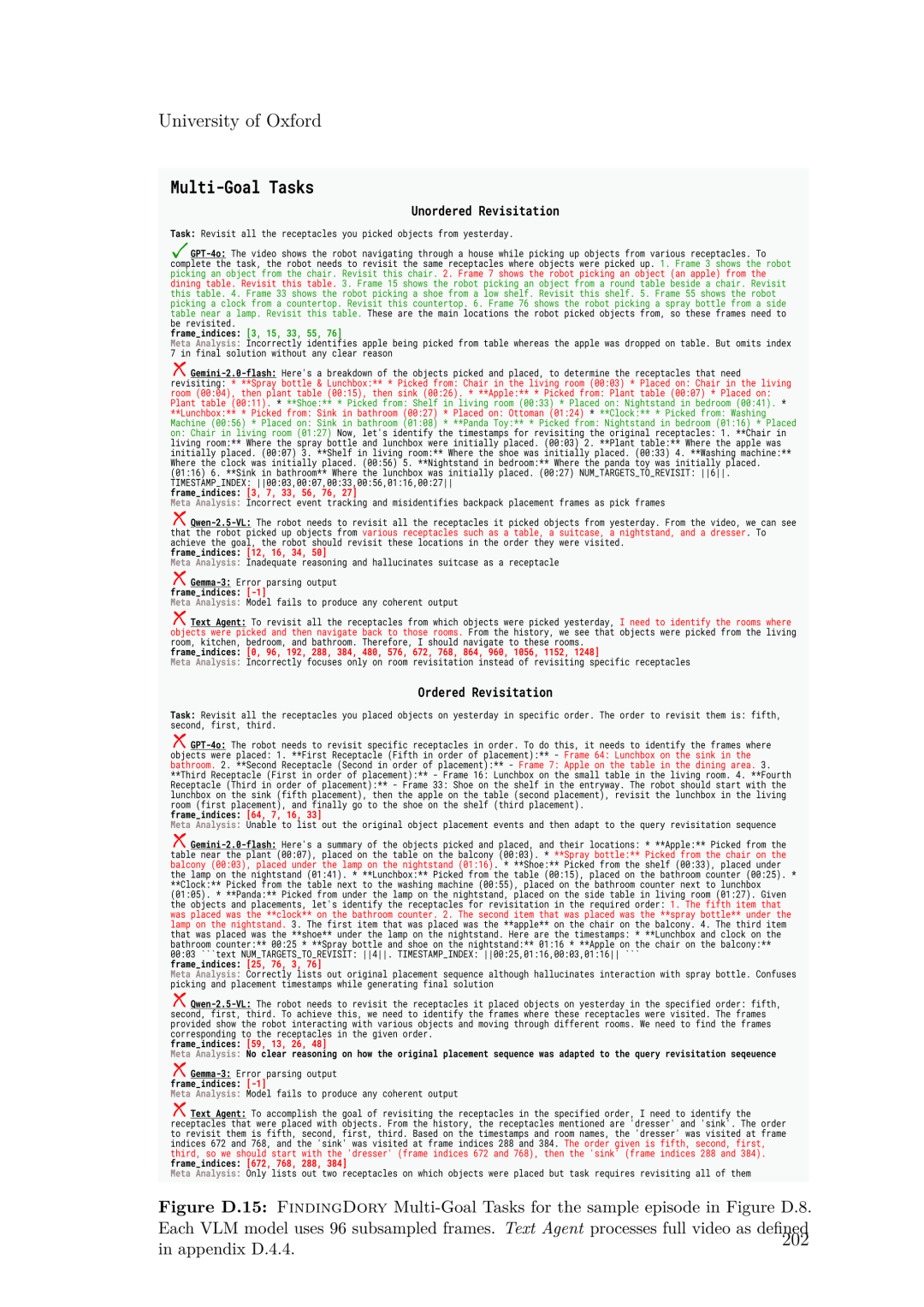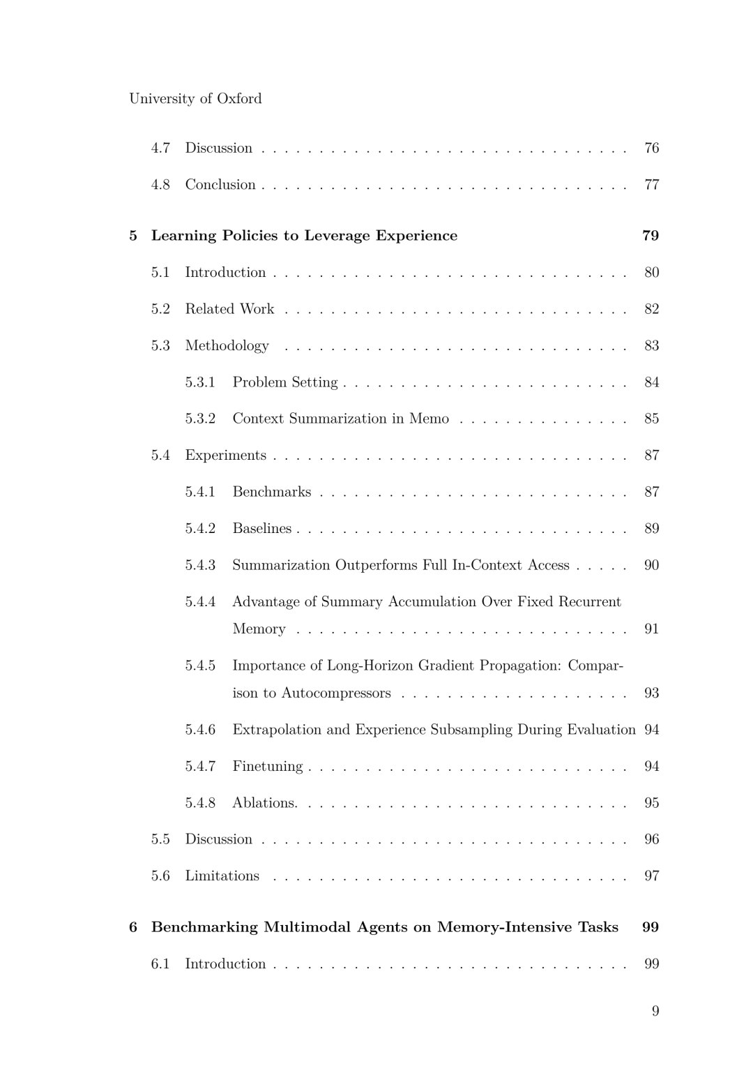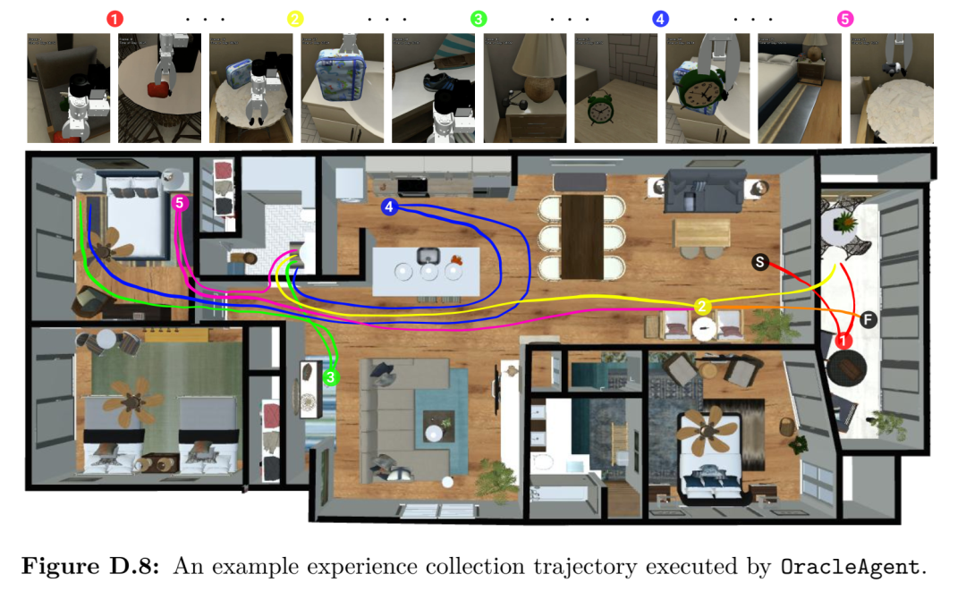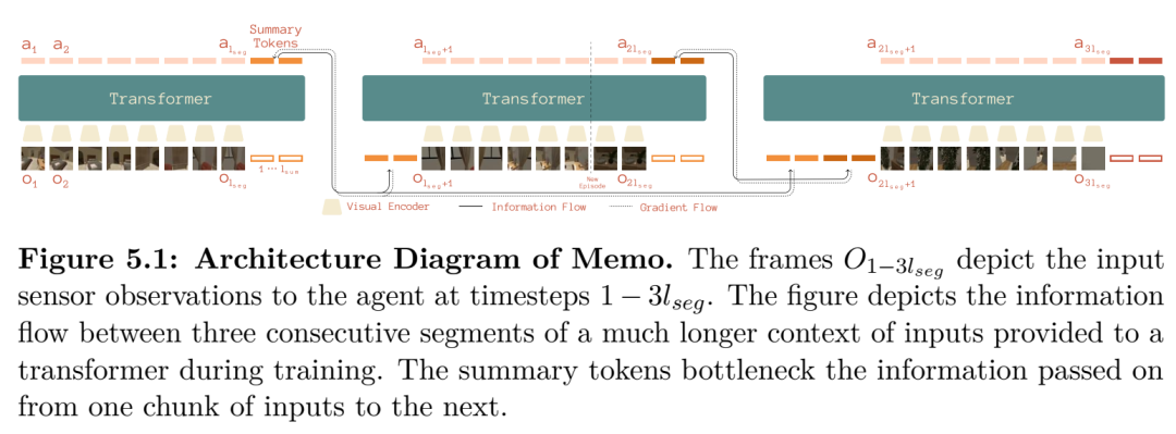 虽然上述章节侧重于学习的效率,但部署后的智能体还必须能够利用跨越数小时或数天的上下文进行高效决策。第 5 章引入了 Memo,这是一种 Transformer 策略架构,它通过在流式观测中交替插入周期性的摘要令牌(Summary tokens),使记忆容量随任务长度平缓增长。为了评估此类长程推理能力,第 6 章贡献了 FindingDory——一个可程序化扩展的基准测试家族,包含 60 个任务,旨在探测具身智能体存储与检索经验的能力。