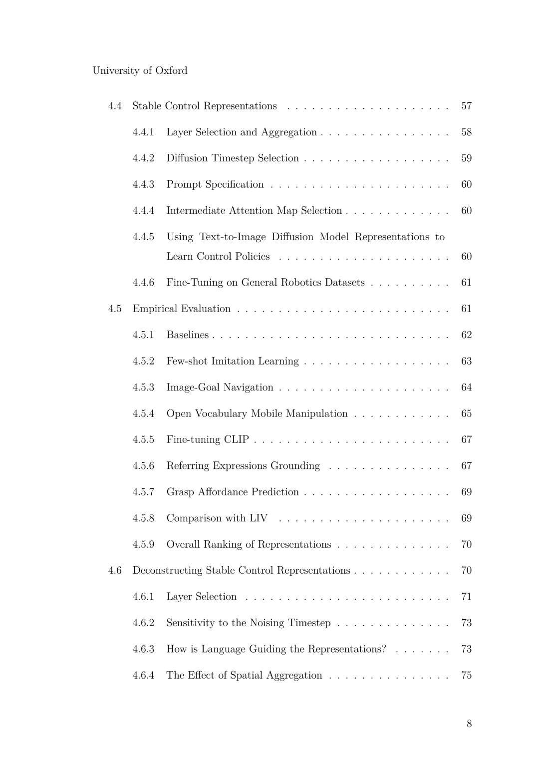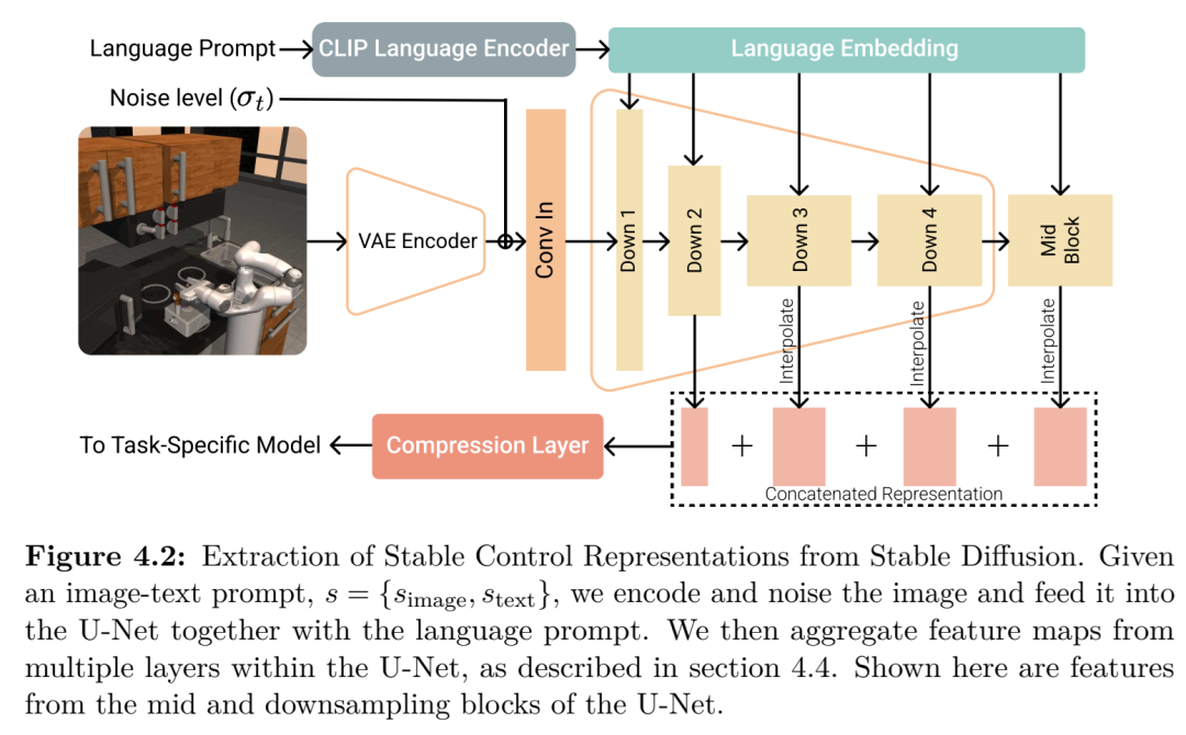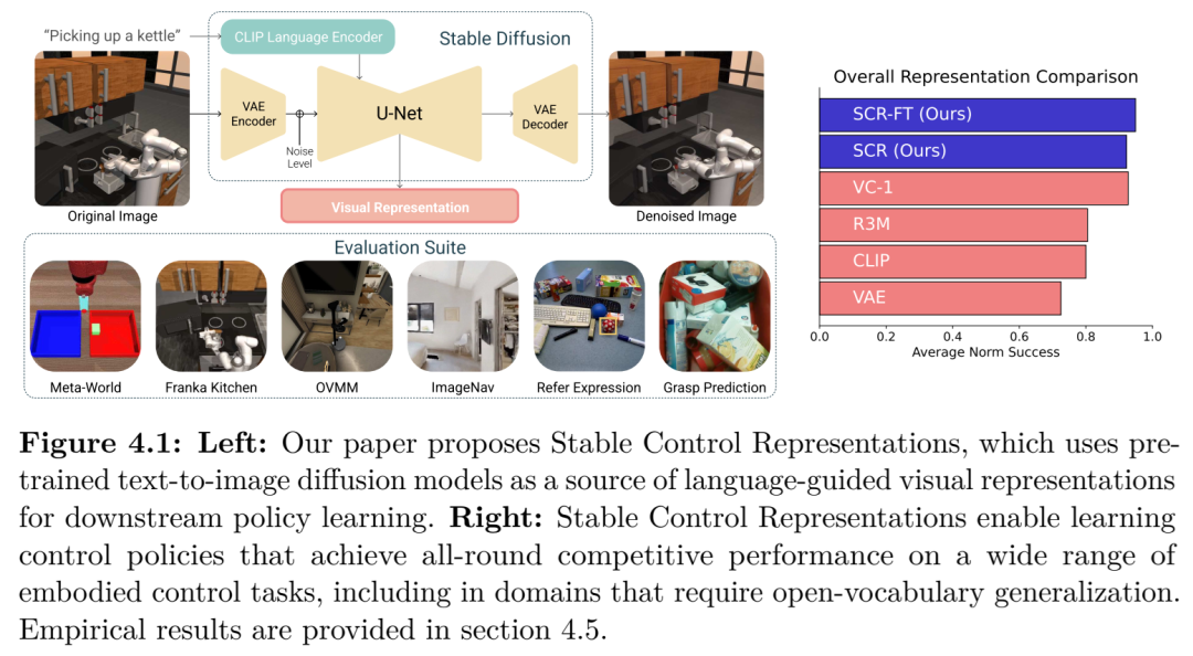即使在不采集新交互数据的情况下,只要能够引入在其他领域学习到的结构化知识,更强的监督学习仍是可能的。第 4 章通过挖掘大型生成式视觉模型的内部表征来探索这一思路。尽管文本生成图像(Text-to-image)的扩散主干网络是为了图像合成而非控制任务训练的,但其积累的多尺度空间与语义线索在机器人数据集中极难从零开始习得。通过冻结这些主干网络并将其多层激活值投射至一种易于控制的嵌入空间——我们称之为稳定控制表征(Stable Control Representations, SCRs)——智能体便可获得关于物体几何形状和语言对齐的丰富归纳先验。在操纵任务和开放词汇导航任务中,SCRs 将达到预设回报所需的梯度步数降低了多达一个数量级,且表现一致优于对比学习训练的编码器,且全过程无需生成任何额外像素。该结果表明,重用预训练知识可将计算昂贵的探索过程转化为廉价的表征重用,从而显著提升样本效率。