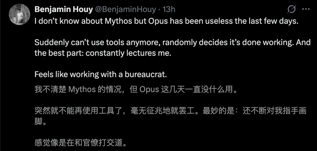 Mythos不是没进步,但Anthropic把「有限进步」包装成了「世界级威胁」;更讽刺的是,一边高调渲染超级AI风险,一边用户却在抱怨Opus 4.6明显变笨。