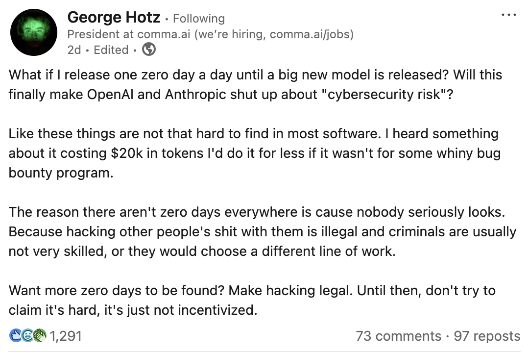 不仅如此,顶级网络安全专家、传奇黑客George Hotz也坐不住了,直言这些风险被严重夸大。