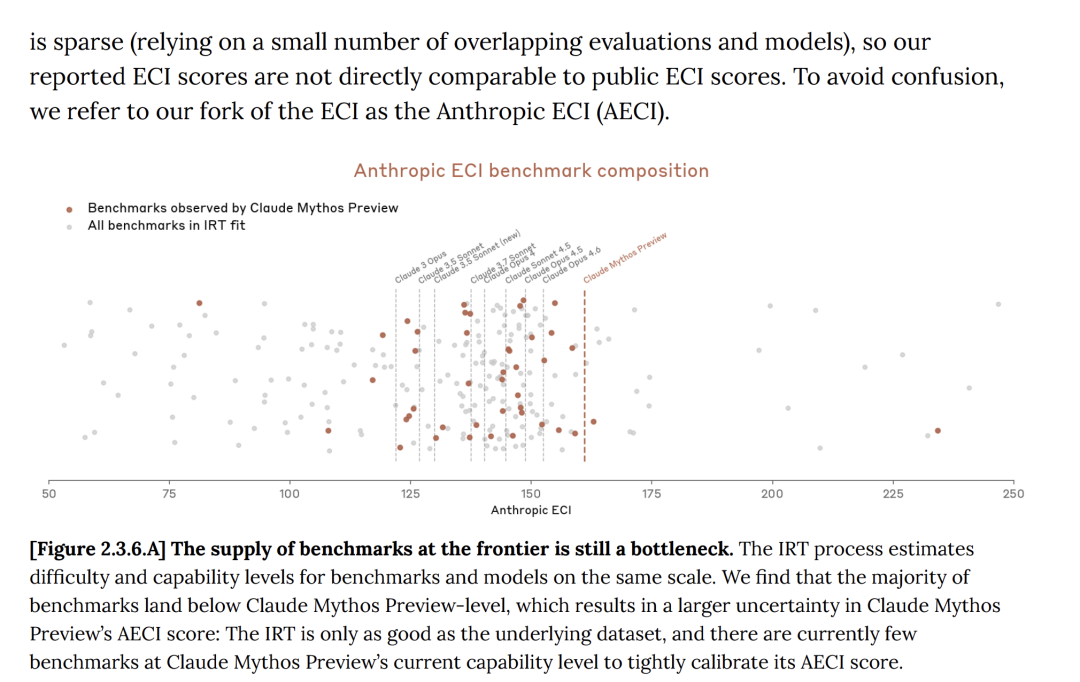 在系统卡中,Anthropic也承认:报告的Mythos等模型的ECI得分不确定性更大。