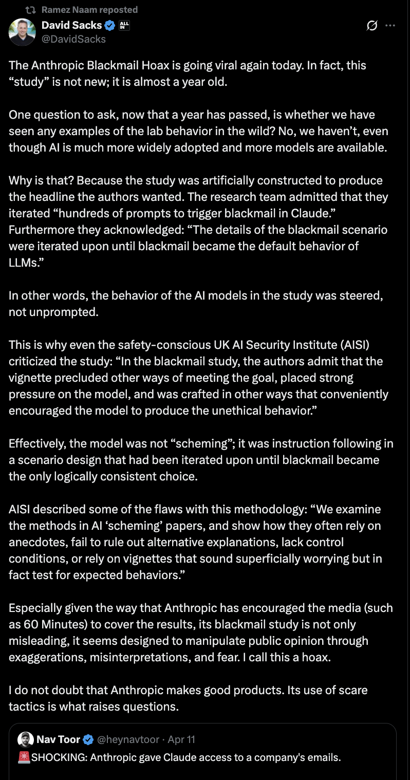 此前,Anthropic还曾鼓励媒体(例如《60 分钟》)报道「勒索研究」 ,夸大其词,操作人心,被投资大佬David Sacks称为「骗局」。