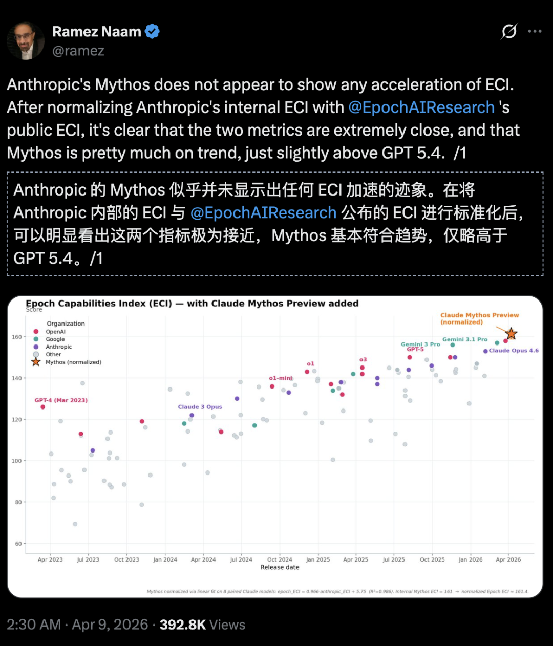 在Epoch能力指数(Epoch Capabilities Index,ECI)上,Mythos并没有加速趋势,只比GPT 5.4强一点。