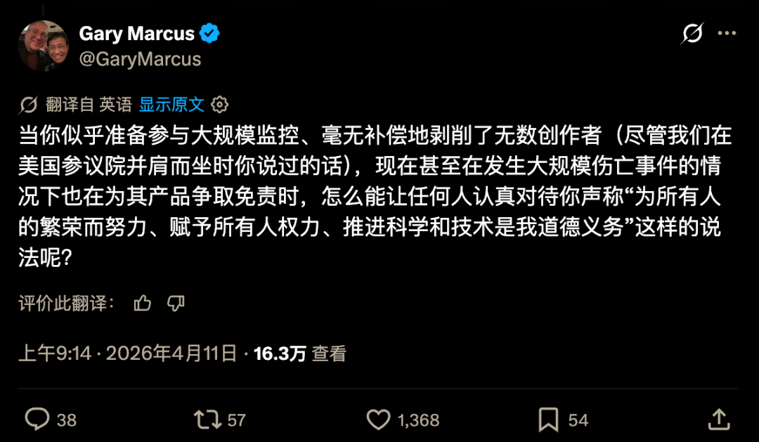 AI 圈知名批评家 Gary Marcus 直接在 Sam Altman 回应自己遭遇袭击的推文下方留言:你一边宣称自己在为所有人的繁荣负责,一边又愿意靠近大规模监控,训练数据争议迟迟说不清,对产品责任问题也不断拉扯,那这些道德宣言还剩多少说服力。