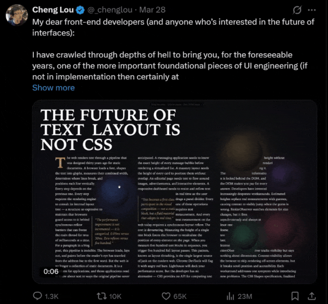 这里他提到的Pretext,是由Midjourney工程师Cheng Lou开源的一款爆火前端工具。