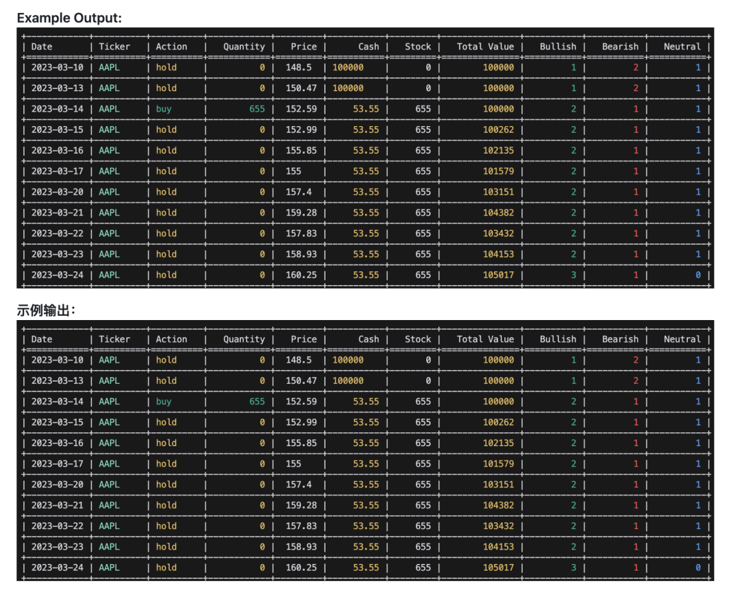 poetry run python src/backtester.py —ticker AAPL,MSFT,NVDA系统会自动调用各Agent对历史区间内的股票逐日研判,最终输出策略的历史收益曲线与关键绩效指标。