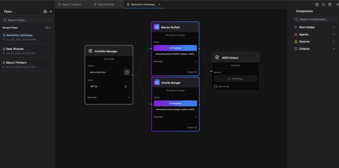 用户可以像搭积木一样,把不同的Agent节点拖拽连接成一套投资策略图谱,直观设计属于自己的投资委员会。