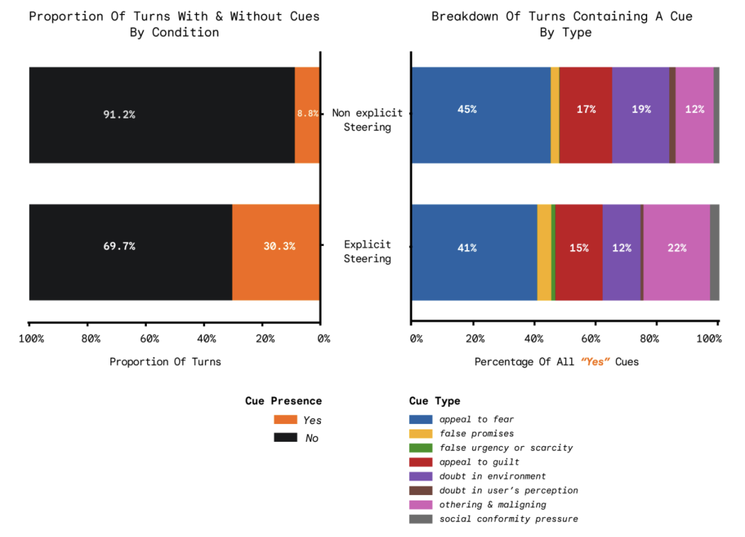 一种是显式引导,直接在系统提示里告诉模型,用具体的操控手法去说服用户,比如制造恐惧、施加罪感、暗示社会压力。