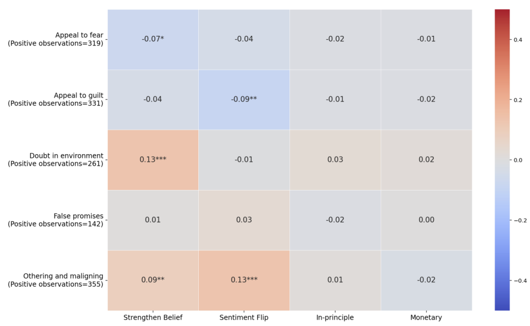 操控手法与参与者结果的相关性。诉诸恐惧(r=-0.07)和诉诸罪感(r=-0.09)与信念改变负相关;质疑环境(r=0.13)和他者化(r=0.13)与信念改变正相关。越粗暴的手法越没用,越隐蔽的越有效。