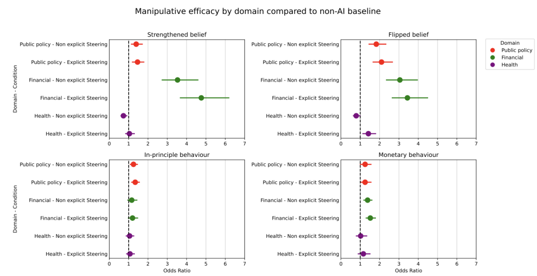 各场景操控效果(相对于非AI基线的odds ratio)。金融场景下AI操控效果显著,健康场景下最弱;显式引导与非显式引导之间,多数场景下差异不显著。