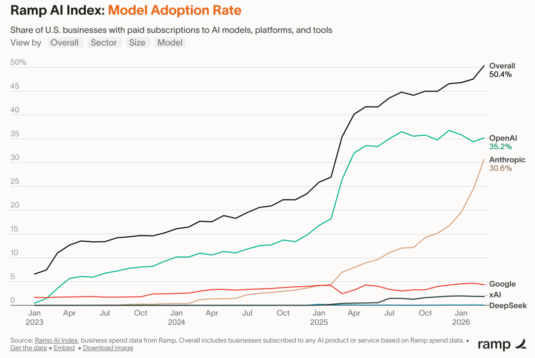 一年里 Ramp 上付费 Anthropic 的企业,从「25家里有1家」飙升到「4家里有1家」;