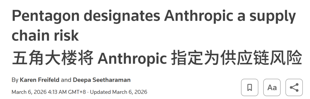 代价是惨重的——特朗普直接下令所有联邦机构停用 Anthropic 的技术,国防部把 Anthropic 列为「供应链风险」。