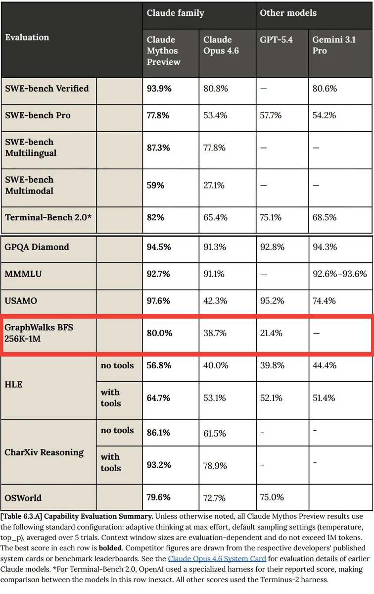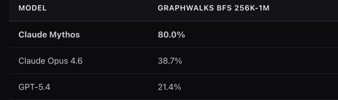 再看Mythos,正是在广度搜索优先的图搜索测试GraphWalks BFS中,超越对手GPT5.4最多。