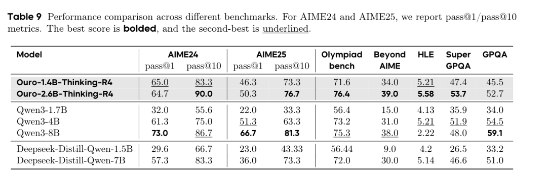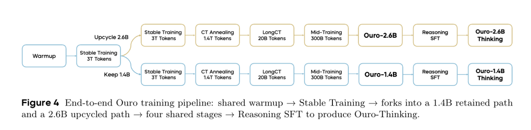 在实验中,团队训练了Ouro系列循环语言模型,内置了循环思考。