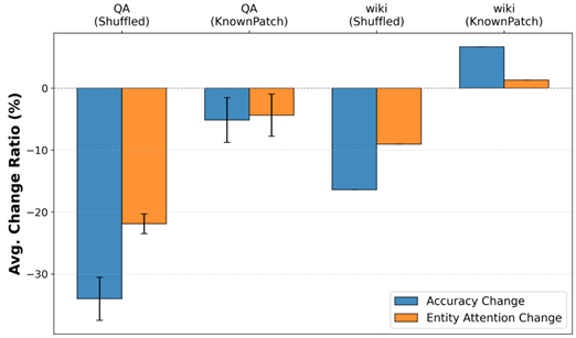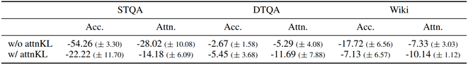 对于未知知识占比的幻觉实验(上文图1),我们分析其注意力变化,结果如图4所示。我们发现对关键实体的注意力分数与幻觉程度高度相关,而且某一类别全部为未知知识时(RemoveKnown)下降更明显。进一步我们尝试在学习新知识的时候加入一个额外的KL损失约束所有层的注意力模块输出与训练前的模型保持一致,从表3可以看出,约束注意力变化之后在STQA和Wiki两个测试集上幻觉程度明显减轻,这一定程度上说明了模型注意力模式和事实性幻觉的因果关系。