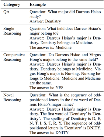 为了构建完全未知的知识以准确分析,本研究参考相关工作[2]通过构造可控的合成数据集Biography-Reasoning用于微调和测试,分析LLMs在学习新知识时产生的幻觉问题。该数据集以虚拟人物为关键实体,为每个人物构造传记。每人具有四个属性:Birth、Death、Major、University;每个属性可以对应构造一个知识问答任务和三个推理任务,包括单人物属性推理(Single Reasoning)、两个人物同一属性的比较推理(Comparative Reasoning)、新定义的推理(Novel-Reasoning)。该数据集可以使得不同知识类别(人物属性)可以单独学习和评估;同时涉及了事实性知识任务中最常见的知识问答和知识推理任务;过程中可以混合不同知识类别、任务类型、未知数据比例。下表示例为数据集中人物“Darreus Hsiao”的Major属性构造的问题。