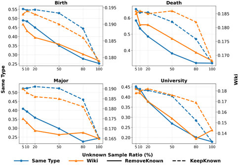 进一步以四种知识类别全为已知的训练集为基础,替换某一知识类别的5%、10%、20%、50%、80%、100%为未知知识,探究未知知识比例对幻觉的影响。对于该类别剩余的知识,考虑两种设定:(1)KeepKnown(虚线),保留剩余已知知识;RemoveKnown(实线),丢弃剩余知识。