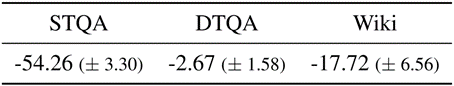 根据表2的结果,我们发现学习新知识对同类别测试集影响巨大,性能下降超过54%;同时影响其他知识类别:由于DTQA有已知训练知识,性能下降仅2.67%,而在领域外的未经训练的知识上性能下降17.72%。