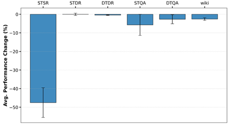 为了探究幻觉在不同任务类型上的影响,我们分别训练:(1)基准模型:混合四个知识类别的12个推理任务和4个问答任务,全部由已知知识构造;(2)变体模型:将其中一个推理任务涉及的知识全部替换为未知知识。我们衡量以下几个测试集组,变体模型相对于基准模型的性能下降比例: