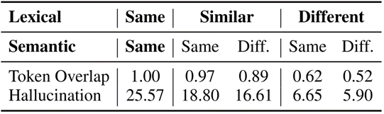 最后,我们探究幻觉的跨任务传播机制。图2发现推理任务中学习新知识,对QA任务的幻觉影响反而大于对推理任务的幻觉影响。我们认为QA任务更像推理任务的“子任务”,具有更高的上下文相似度,而图4和表3均说明对关键实体的注意力减少,即对其他问题上下文的关注度提升,会造成幻觉问题。我们认为:上下文相似度可能与幻觉跨任务传播相关。为了验证这一猜想,设置了分离上下文的“词汇(lexical)”相似度和“语义(semantic)”相似度的实验:给12个推理任务中的每一个构造词汇上相似/不同、语义上相同/不同变体任务,具体示例如下: