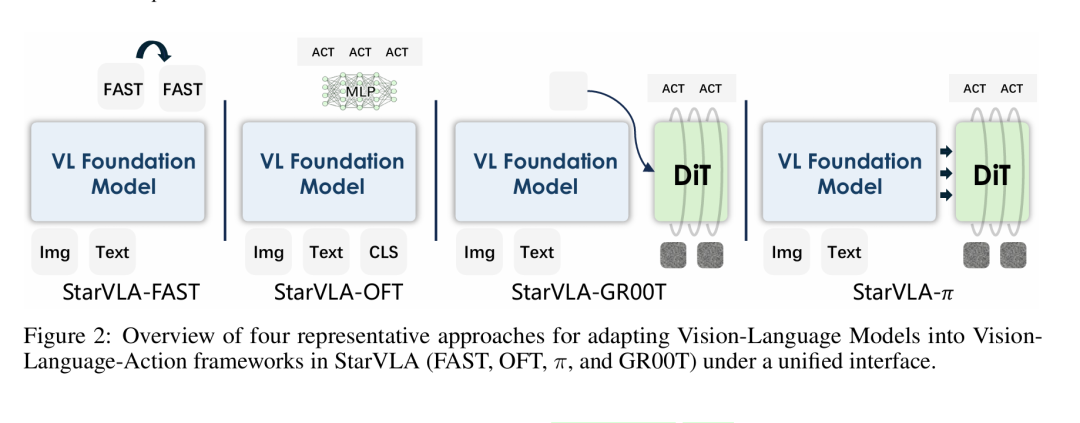 架构割裂:自回归离散Token化、并行连续回归、流匹配去噪、双系统推理……不同动作解码范式采用完全不同的代码实现与接口假设。