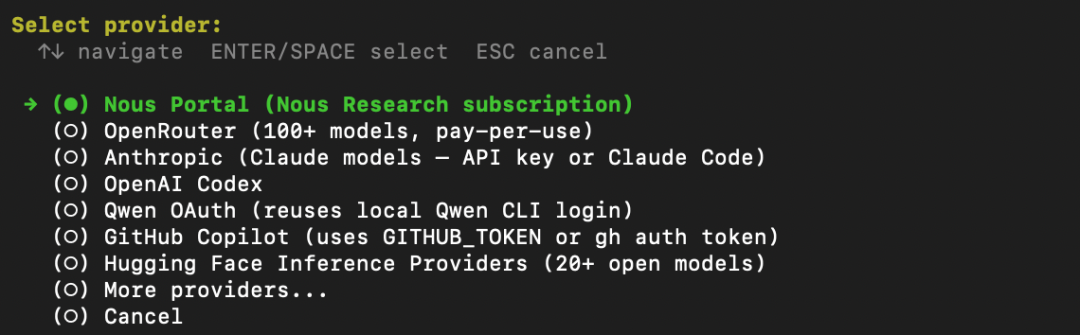 装完之后,准备好你想用的模型API,GPT、Claude、GLM、MiniMax、Kimi、Qwen、DeepSeek……都可以,然后按照Hermes的指引完成模型配置就行。