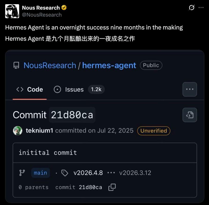 Hermes Agent由Nous Research团队发布,用他们自己的话说,这个项目的爆火是“9个月磨一剑”。