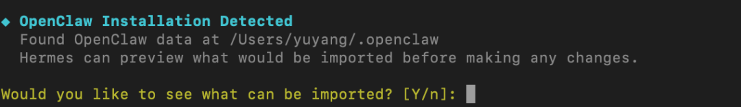 p.s. 如果你同时也养了OpenClaw,Hermes会自动检测,问你要不要自动导入OpenClaw的设置、记忆、技能和API配置。