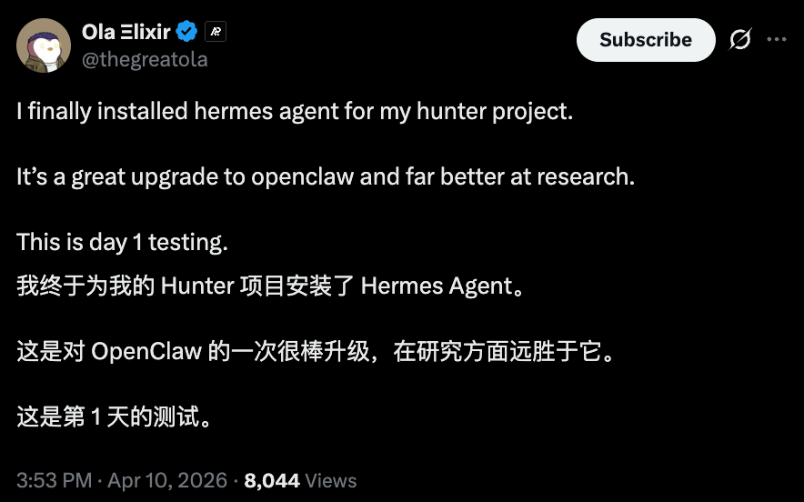 Hermes爆火之后,来自开源社区的实测也证明,在需要深度研究的项目中,Hermes比OpenClaw更胜一筹。