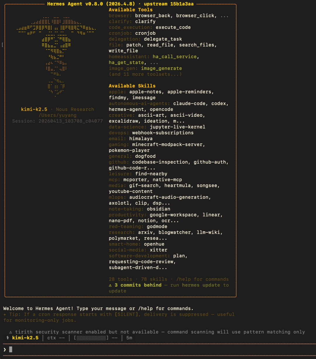 之后在终端里输入「hermes」,就可以开启与智能体的对话。