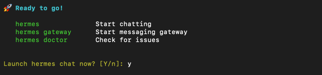 最后一步,输入「Y」,启动Hermes chat。