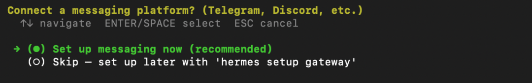 Hermes也会提醒你设置好信息接口,钉钉、飞书、微信都支持。