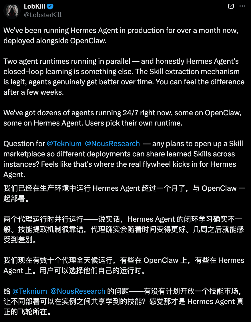 不过,目前爱马仕并没有和OpenClaw一样的技能市场。有用户认为,如果大家能共享爱马仕们学到的技能,“那才是Hermes Agent的飞轮所在”。