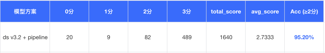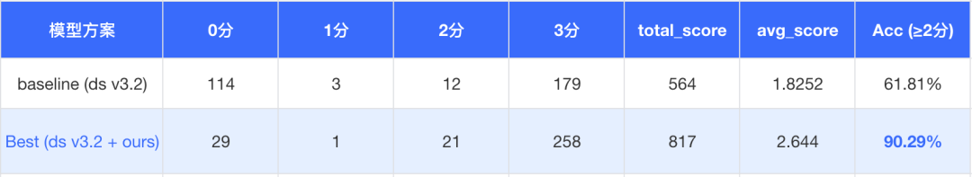 提升幅度:准确率(≥2 分)从 61.81% 提升至 90.29%(+28.48pp),平均得分从 1.825 提升至 2.6440(+0.8015)。