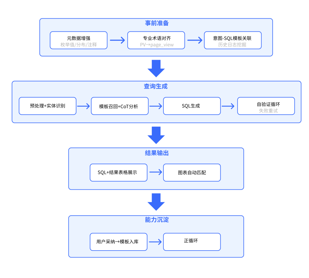 模板沉淀正循环:用户点击“答案正确/采纳”时,系统将“标准化问题 + 最终 SQL”沉淀到模板库,后续优先召回高频、高评分模板。