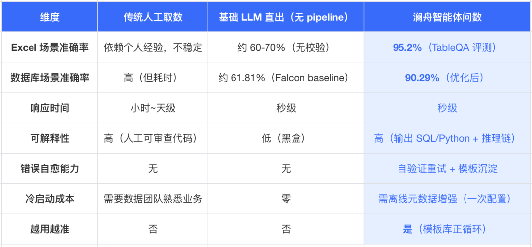 澜舟智能体问数技术并非简单调用 LLM 生成代码,而是一套工程化 pipeline——通过 Schema 校验、元数据增强、术语对齐、模板召回、CoT 推理、自验证循环、结果沉淀等机制,将自然语言问答的准确率从基础 LLM 的 60-70% 提升至 95%(Excel)和 90%(复杂数据库跨域场景)。更重要的是,它具备可解释(输出代码与推理链)、可进化(模板正循环)、可落地(沙箱执行,失败重试)的特性。