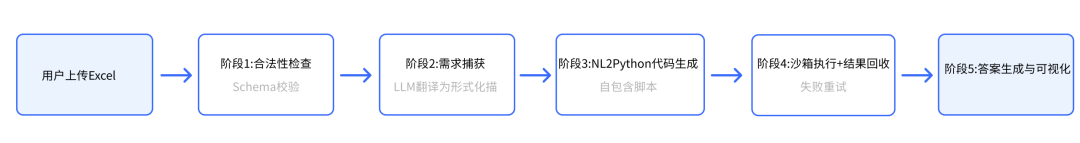 生成的 Python 代码通过 exec() 在沙箱中执行。成功时,标准输出与序列化结果(CSV/JSON)被捕获;失败时,系统捕获报错信息,重新生成代码。