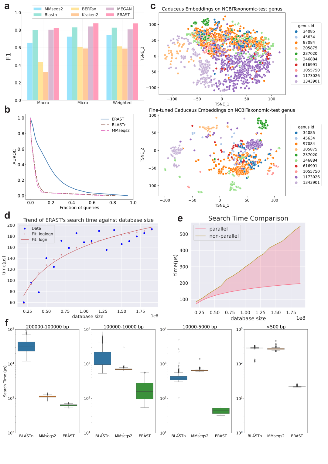 借助稠密向量与索引量化技术,ERAST 在由 UniParc、UniRef90、UniRef50 及 RefSeq 构成的十亿级向量数据库上实现了毫秒级检索。在蛋白质检索实验中,ERAST 在相同计算资源下(64核 CPU)对比发现,其无重排序版本在速度与精度上均优于现有的深度学习及结构比对方法:其检索速度比 Foldseek 快 50 倍,比 TM-align 快 5 万倍,且 P@10 精度更高。针对长核苷酸序列,通过将序列映射为固定维度的稠密向量,ERAST 在各长度区间(从 500bp 以下到 10 万 bp 以上)均保持最快速度;当序列超过 10 万 bp 时,其速度约是 BLASTn 的 60 倍、MMseqs2 的 2 倍。通过在 Swiss-Prot 和 UniRef90 子集上的扩展性测试证实,采用并行搜索策略使 ERAST 的时间复杂度从 O(n) 降至 O(log n) 到 O(loglog n) 之间,从而实现在毫秒内完成对超过 10 亿规模数据库的查询。
