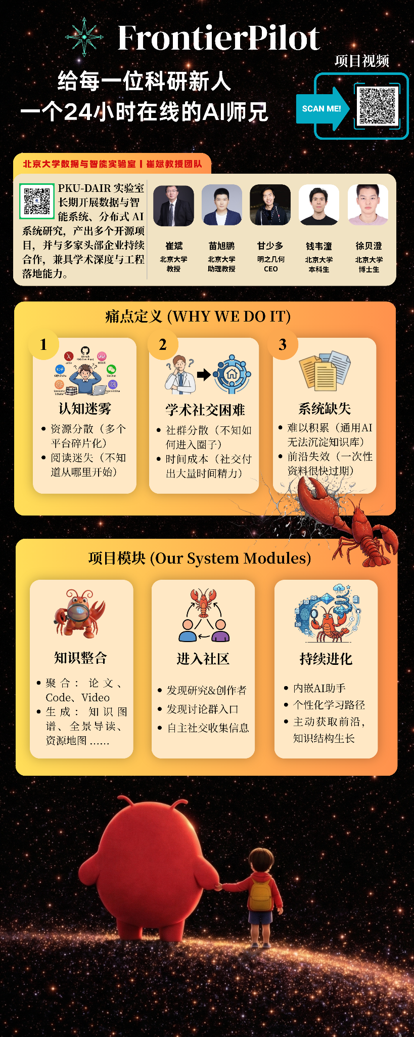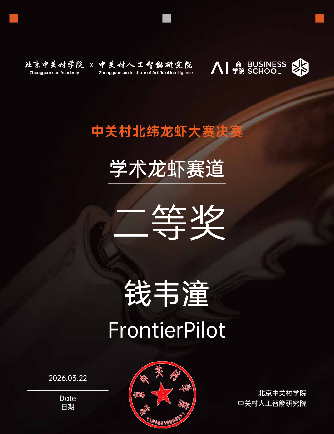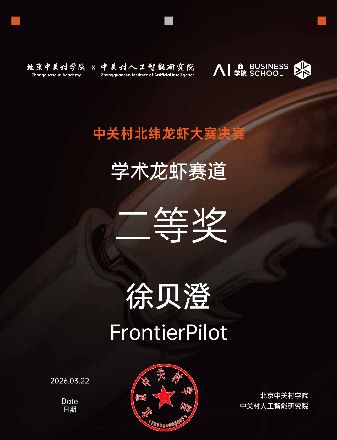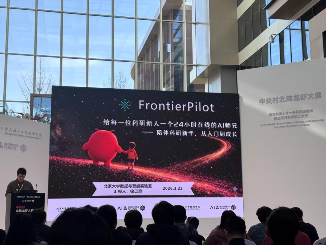 2026年3月22日,由北京中关村学院、中关村人工智能研究院等等单位联合举办的“中关村北纬龙虾大赛”决赛落下帷幕。北京大学数据与智能实验室(PKU-DAIR)项目《FrontierPilot:成长型科研探索智能体》在学术赛道中脱颖而出,荣获二等奖。团队成员为博士生徐贝澄、本科生钱韦潼。