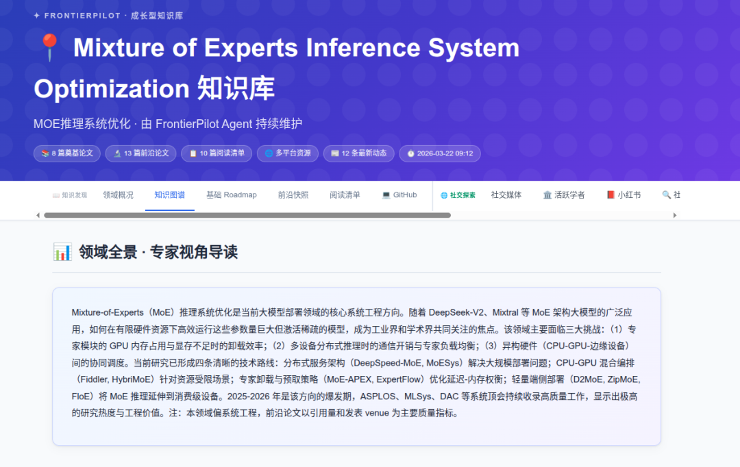 第一,系统实现多源知识的结构化整合。面对新手的科研方向,系统自动聚合论文、代码、专家评审及相关资源,利用Agent的逻辑推理能力,生成结构化的领域全景、领域图谱、演进脉络、前沿快照和资源地图等,帮助用户快速从碎片化材料中形成完整的知识框架。