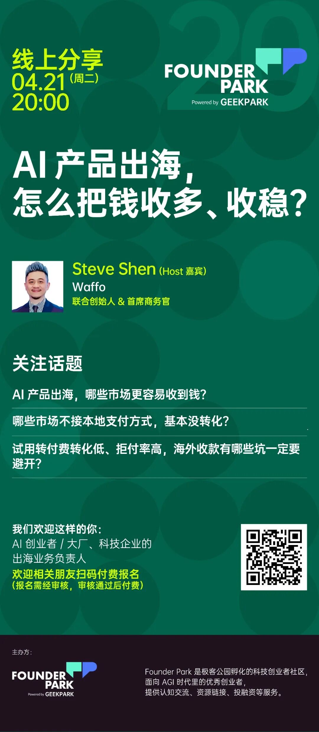 下周二(4 月 21 日),我们邀请到 Waffo 联合创始人 Steve Shen,围绕 AI 产品出海的支付增长、避坑实践等,进行线上分享和实时交流。