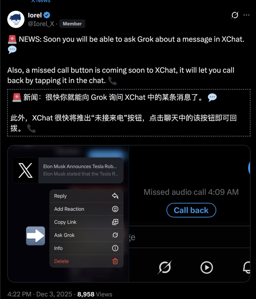 在XChat里,AI 不再是辅助,而是通讯的一部分。它不仅能处理文字,还能处理音频和视频。对于Premium用户,XChat甚至支持最高4GB的超大文件传输。