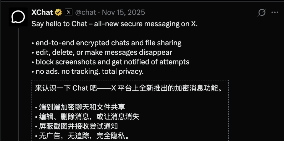 除了你和对方,全世界没有任何人能看到聊天内容——包括X公司的程序员,甚至马斯克本人。
