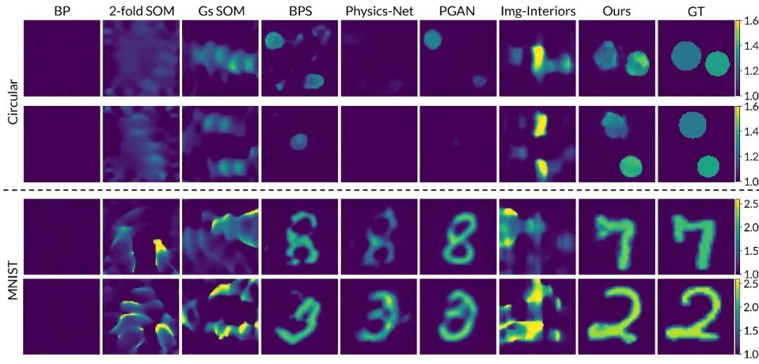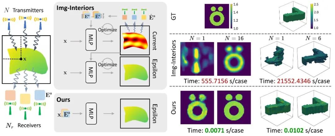 现有方法在该设定下面临明显局限:基于物理的数值方法[1-4]在数据不足时难以获得可靠结果;结合机器学习的方法[5,6]通常依赖初始反演,难以纠正其误差;而基于优化的方法[7]需要逐样本优化,即使收敛也可能偏离真实解,难以应对单发射器等极端稀疏场景。