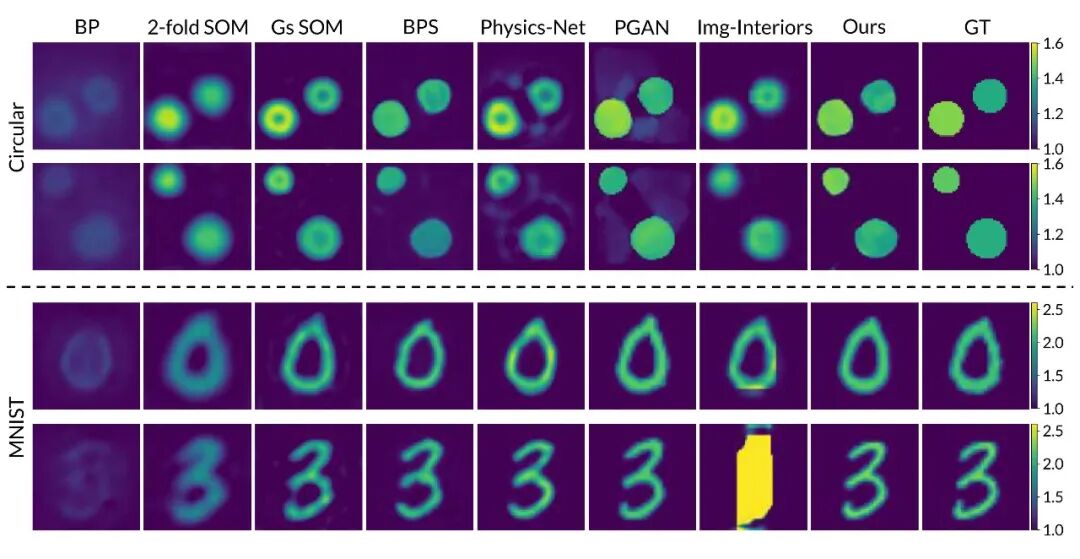 与依赖复杂物理建模或逐步反演的方法不同,我们的模型通过在多种散射场景上的训练,有效学习散射场与介电常数之间的映射关系,从而引入数据分布先验,以弥补由于测量信息不足带来的物理信息缺失。
