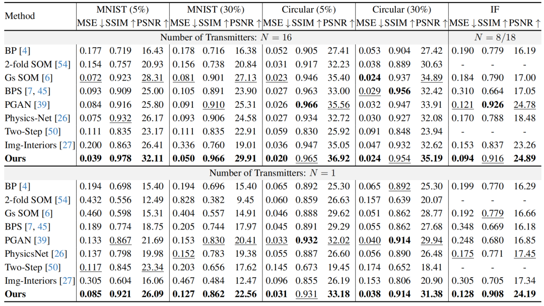 我们首先在多发射器设置下,将所提出的方法与已有方法进行比较,并在合成数据集 MNIST[8],Circular[7]与真实数据集 IF[9]上进行全面评估。如表1上半部分所示,我们的方法在大多数情况下均取得了与 SOTA 方法[5,6,7]相当或更优的性能。这一结果说明,所提出的端到端框架能够有效学习不同数据域中的结构规律,并充分利用数据先验来提升重建质量。