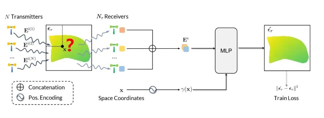 我们采用一个简单而高效的神经网络模型(MLP),用于直接学习电磁逆散射问题这一复杂的非线性映射关系。输入包括空间位置,对应的电磁散射测量信号,模型会对每一个位置进行预测,输出该位置的介电常数。通过在整个区域上逐点预测,最终可以恢复出完整的内部结构分布。